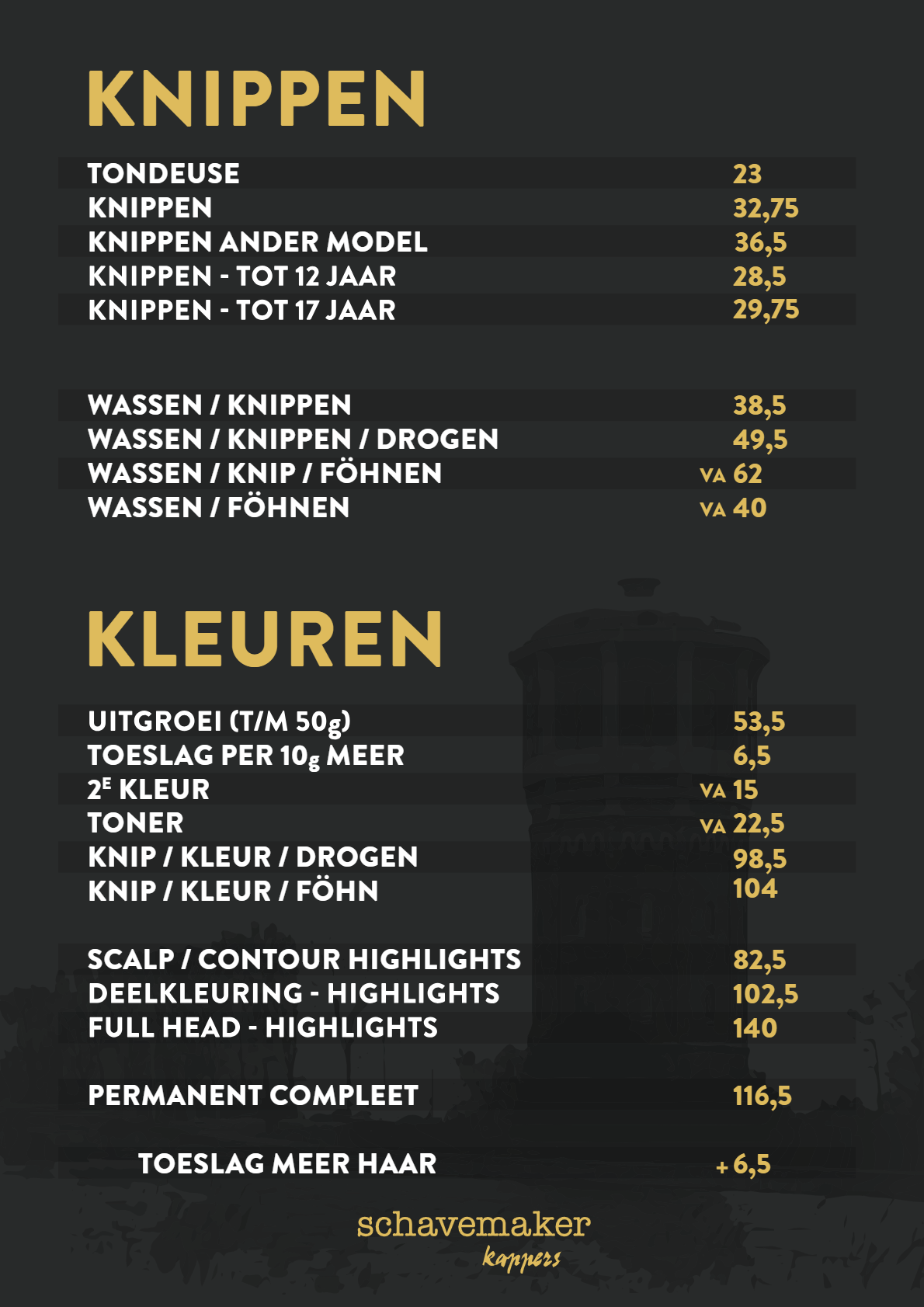 Deze prijzen zijn een indicatie en omvatten slechts een deel van onze behandelingen. Voor meer informatie kunt u terecht in onze zaak. Prijzen onder voorbehoud van prijswijzigingen etc.